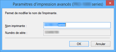 Pour modifier les noms des imprimantes affichées, utilisez la boîte de dialogue Paramètres d'impression avancés qui s'affiche lorsque vous cliquez sur le bouton Paramètres avancés.
