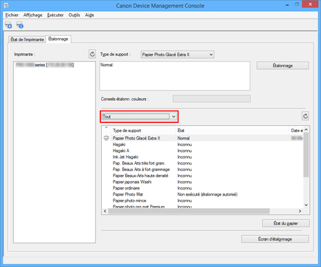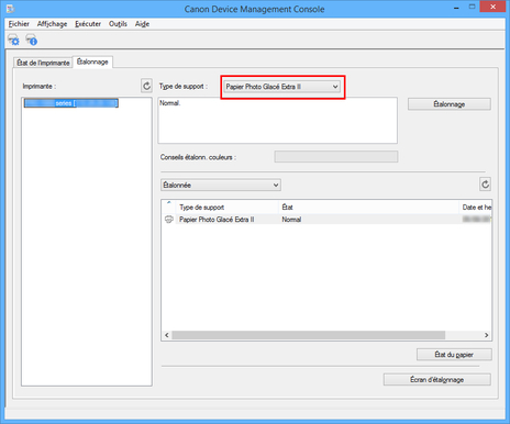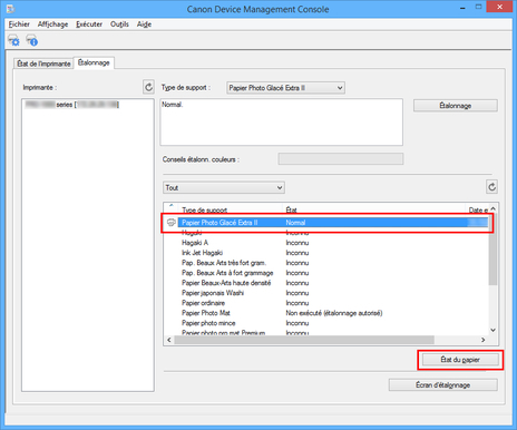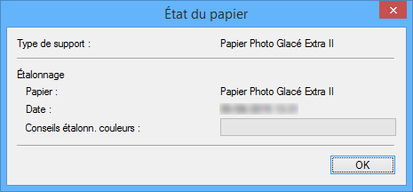 Vous pouvez vérifier l'état d'étalonnage des couleurs pour le papier sélectionné.