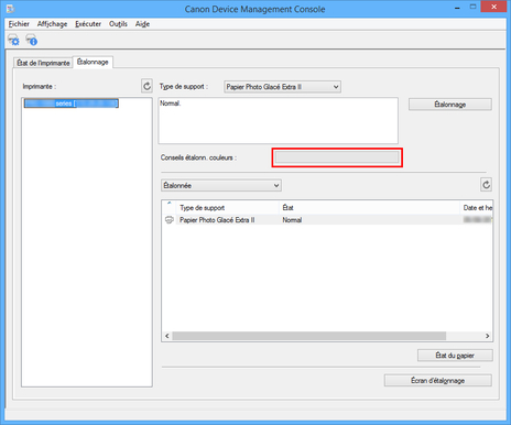 Vous pouvez consulter le journal d'exécution de l'étalonnage des couleurs pour chaque papier.