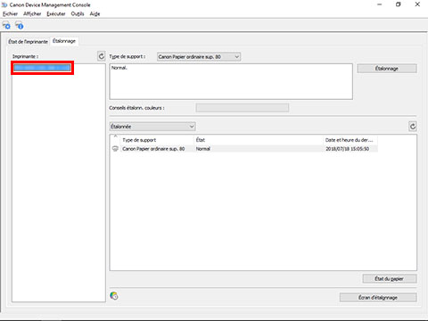 Dans la liste des imprimantes, sélectionnez l'imprimante pour laquelle vous souhaitez exécuter un étalonnage des couleurs.