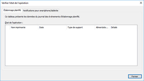 Vous pouvez vérifier les journaux de l'étalonnage planifié des couleurs dans la boîte de dialogue Vérifier l'état de l'opération.