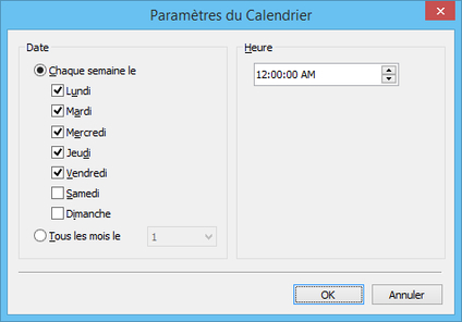 Pour ouvrir la boîte de dialogue Paramètres du Calendrier, cliquez sur le bouton Calendrier dans la boîte de dialogue Conditions de notification ou la boîte de dialogue Étalonnage planifié.