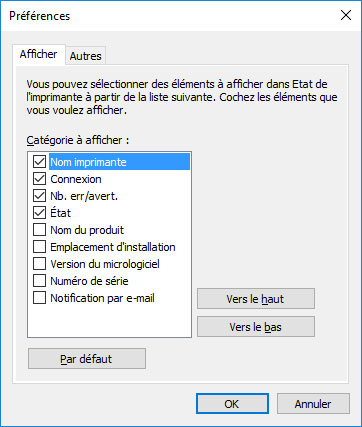 Vous pouvez sélectionner l'élément à afficher dans État de l'imprimante.