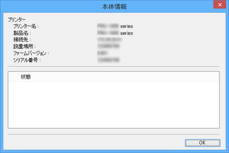 ボタンをクリックすると、[本体情報]ダイアログボックスが表示され、プリンターの詳細な情報を確認できます。