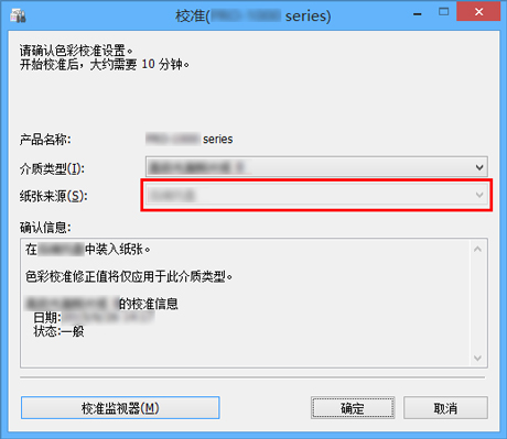 如果显示的纸张来源和装有纸张(用于执行色彩校准)的纸张来源不同,请在纸张来源显示的纸张来源中重新装入纸张。