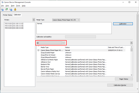 Wählen Sie in der Druckerliste den Drucker aus, für den Sie das Ausführungsprotokoll der Farbkalibrierung überprüfen möchten.