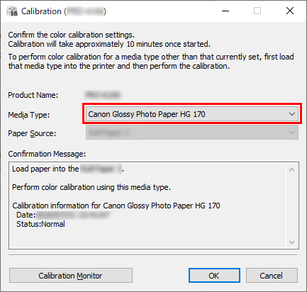 Die Papierzufuhren, für die eine Farbkalibrierung durchgeführt werden kann, werden für das Papier unter Medientyp angezeigt.