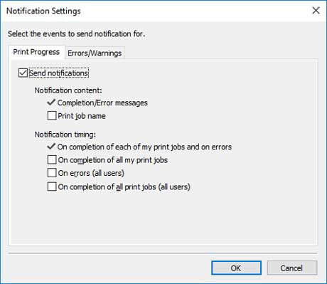 Hinweis- Wenn dieses Häkchen entfernt wird, werden keine Benachrichtigungen gesendet, wenn Druckaufträge anderer Benutzer als derjenigen, die unter Benutzername angezeigt werden, vorübergehend angehalten wurden. Fügen Sie ein Häkchen hinzu, und wiederholen Sie dann den Vorgang.