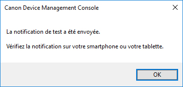 Quand le message envoyé dans la notification test s'affiche, vérifiez que les "Paramètres de notification ont été activés" sur le smartphone, puis cliquez sur le bouton OK.