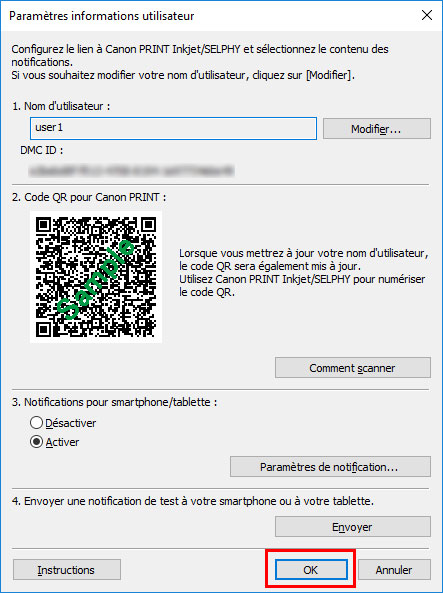 Avec la boîte de dialogue Paramètres informations utilisateur ouverte, accédez à la procédure "Enregistrement de smartphones à l'aide de Canon PRINT Inkjet/SELPHY." Enregistrez un smartphone dans le serveur de notifications.
