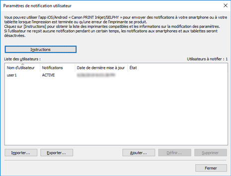 Remarque- Dans les Paramètres de notification de Notifications pour smartphone/tablette, vous pouvez également définir la Progression impression et l'élément Erreur/avertissement. Pour plus d'informations sur les éléments de réglage de la boîte de dialogue Paramètres de notification, reportez-vous à la "Boîte de dialogue Paramètres informations utilisateur".