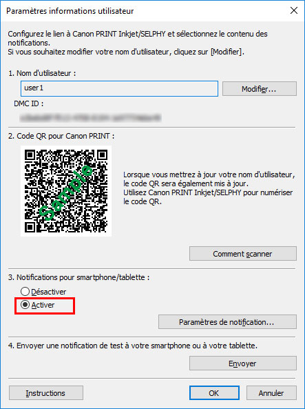 Sélectionnez Activer dans Notifications pour smartphone/tablette de la boîte de dialogue Paramètres informations utilisateur.