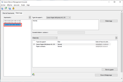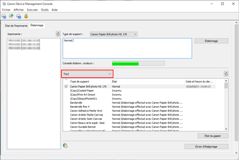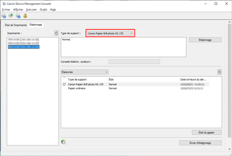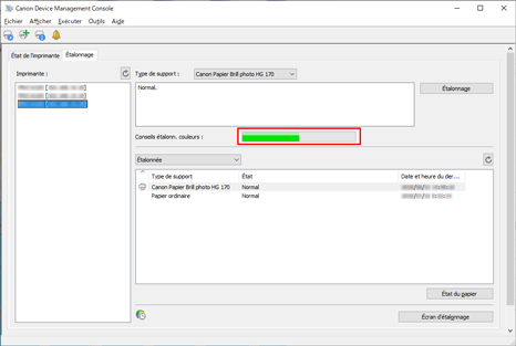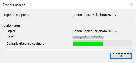 Vous pouvez vérifier l'état d'étalonnage des couleurs pour le papier sélectionné.