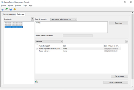 Quand vous sélectionnez une imprimante qui a été définie pour effectuer régulièrement un étalonnage des couleurs,
