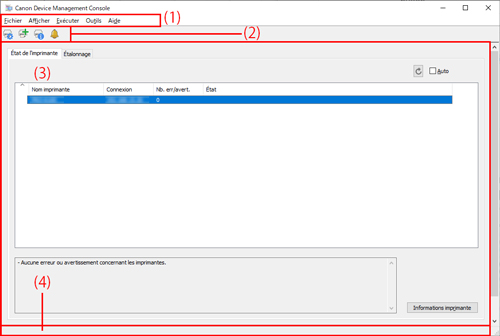 L'état des communications de l'imprimante et l'état des paramètres de Device Management Console s'affichent.