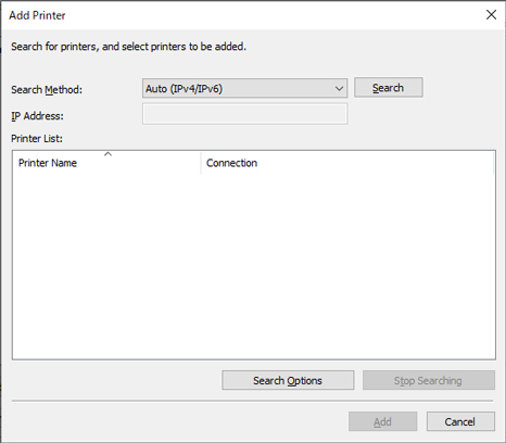 Quando Método de pesquisa é definido para USB, uma pesquisa pelas impressoras locais é realizada.