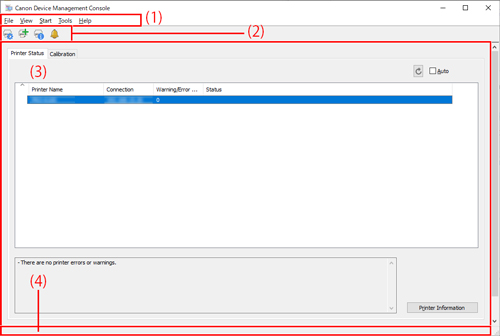 O status das configurações do Device Management Console e o status de comunicação da impressora são exibidos.