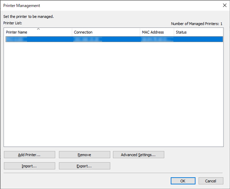 As impressoras gerenciadas que são importadas na Lista de impressoras são exibidas.