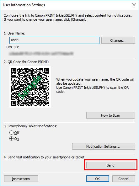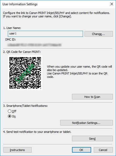 Не закрывая диалоговое окно Информация о пользователе (User Information Settings), перейдите к следующей процедуре: "Регистрация смартфонов с помощью Canon PRINT Inkjet/SELPHY". Регистрация смартфона на сервере уведомлений.