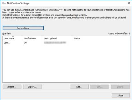 Примечание.- С помощью элемента Параметры уведомлений (Notification Settings) в разделе Уведомления для смартфонов и планшетов (Smartphone/Tablet Notifications) можно также настроить Ход выполнения печати (Print Progress) и Ошибки/предупреждения (Errors/Warnings). Подробные сведения о настройке элементов в диалоговом окне Параметры уведомлений (Notification Settings) см. в разделе "Диалоговое окно "Информация о пользователе"".