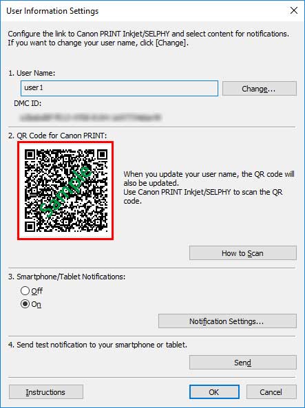 Отсканируйте QR-код для Canon PRINT (QR Code for Canon PRINT), отображаемый в диалоговом окне Информация о пользователе (User Information Settings) в Device Management Console.