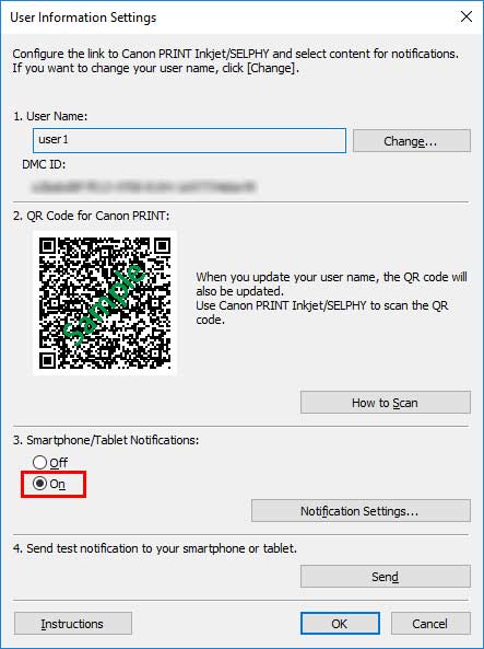 Выберите Вкл. (On) в разделе Уведомления для смартфонов и планшетов (Smartphone/Tablet Notifications) в диалоговом окне Информация о пользователе (User Information Settings).