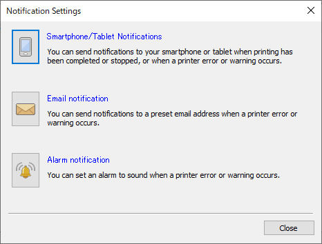 Нажмите, чтобы открыть диалоговое окно "Параметры уведомлений для пользователей". Отправляйте уведомления о заданиях печати и состоянии принтера на смартфоны или планшеты.