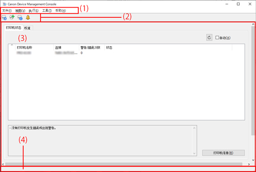 Device Management Console的主屏幕由菜单栏、工具栏、主区域和状态栏构成。