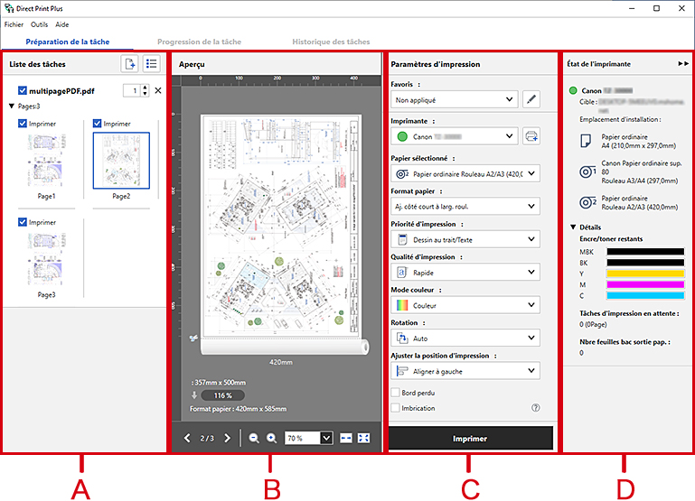 L'écran d'accueil Direct Print Plus peut être utilisé de gauche à droite en fonction du flux de travail, ce qui vous permet d'imprimer tout en vérifiant la mise en page. Vous pouvez également sélectionner les fonctions qui vous intéressent dans la barre de menus.