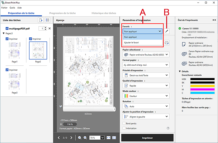 Vous pouvez enregistrer les paramètres actuels de Direct Print Plus ou répliquer les paramètres enregistrés pour les paramètres actuels.