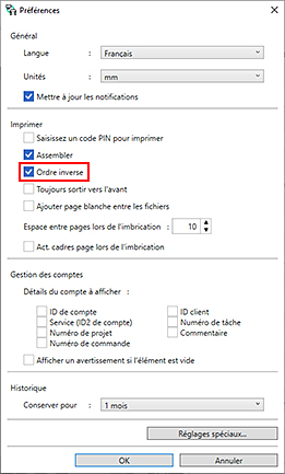 Si vous sélectionnez la position de sortie du papier avec la face d'impression vers le haut, la première page sera placée en bas et l'ordre des pages sera inversé. Si vous sélectionnez Ordre inverse, le tri des pages n'est pas nécessaire.