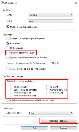 Si vous cochez cette option, les imprimantes Canon avec plusieurs positions de sortie papier seront configurées pour une sortie systématique par l'avant.