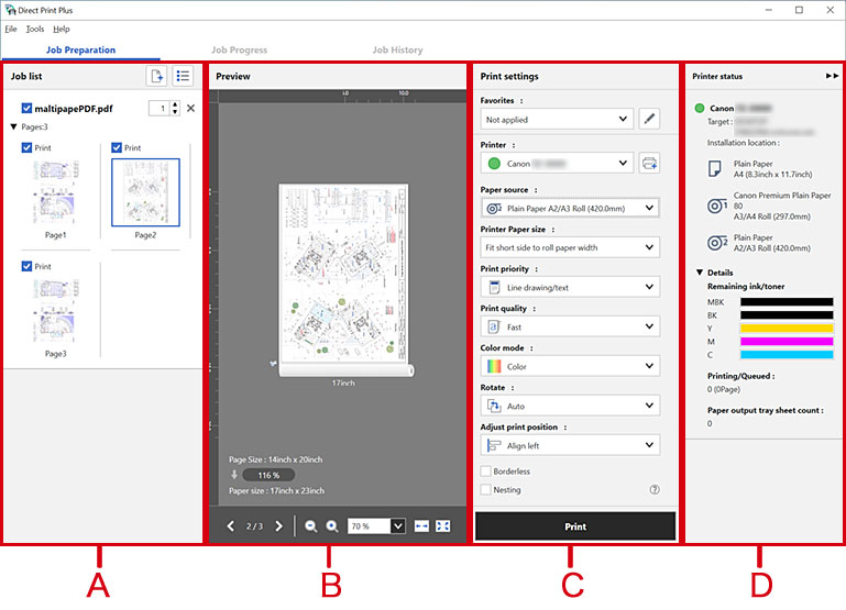 È possibile visualizzare la schermata iniziale di Direct Print Plus da sinistra a destra in base al flusso di lavoro per stampare mentre si verifica il layout. È anche possibile selezionare le funzionalità che si desidera utilizzare dalla barra dei menu.