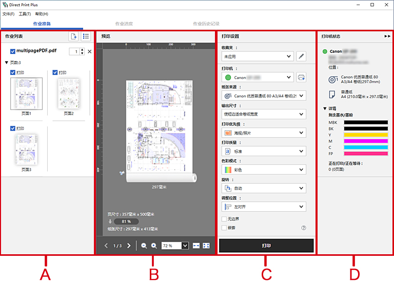 可以按照工作流程,从左侧到右侧操作Direct Print Plus主页屏幕,从而可以在检查布局的同时进行打印。 也可以从菜单栏中选择操作所需的功能。