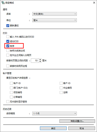 如果选择打印面朝上的出纸位置,第一页将位于最下面,且页面顺序将颠倒。 如果选择倒序,则无需对页面进行排序。