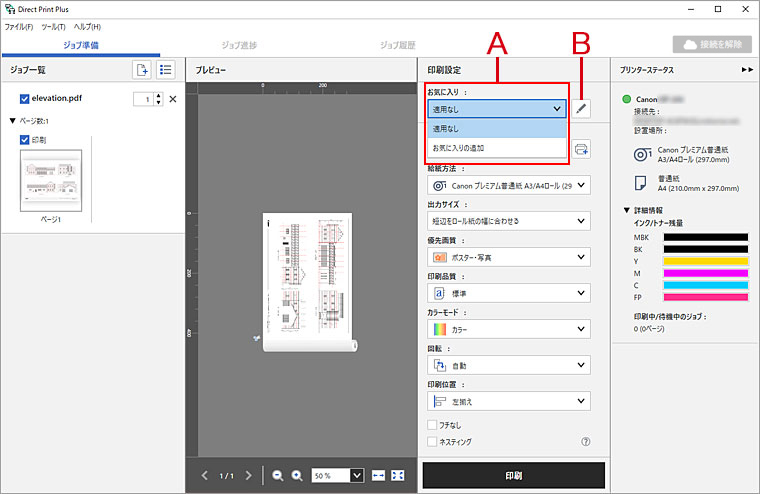 - ファイル形式がTIFF/JPEG/PDFとHP-GL/2とではよく使う設定の保存項目が異なるため、保存時と異なるファイル形式へ印刷する場合は、よく使う設定に反映できません。