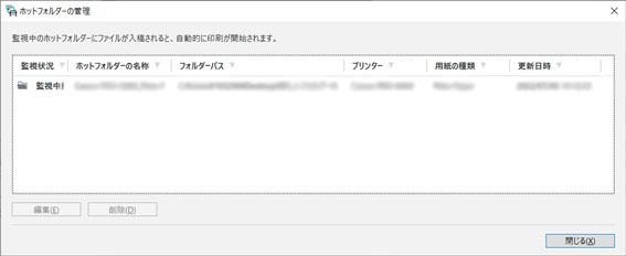 [監視状況]が[監視中]となっているフォルダーにファイルが追加されると、自動で印刷されます。[停止中]であれば印刷されません。