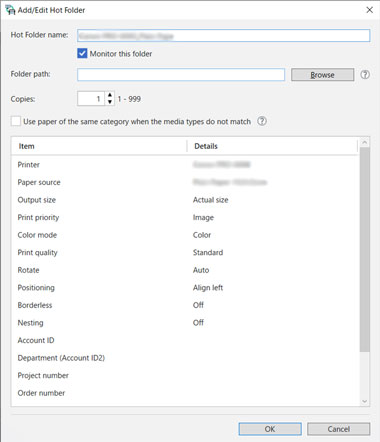 핫폴더 추가/편집(Add/Edit Hot Folder) 대화 상자가 열립니다. 각 항목을 설정합니다.