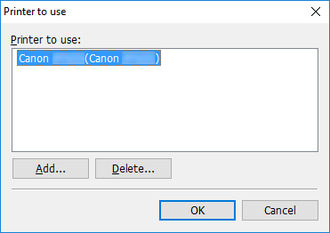 Hierdurch wird das Dialogfeld Zu verwendender Drucker (Printer to use) geschlossen, und die in der Liste Zu verwendender Drucker (Printer to use) enthaltenen Drucker werden im Pulldown-Menü Drucker (Printer) im Hauptbildschirm angezeigt.