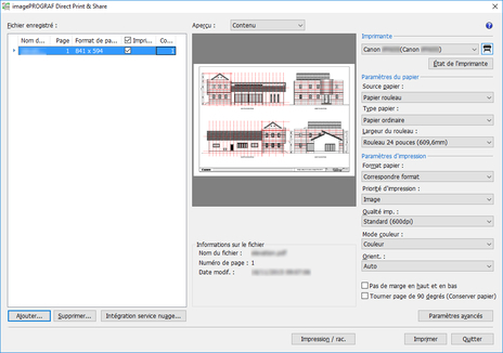 Vous pouvez spécifier les fichiers à imprimer sur l'écran principal de Direct Print & Share. L'écran principal est composé de la liste Fichier enregistré affichée à gauche, de la zone d'aperçu affichée au centre et de la zone des paramètres d'impression affichée à droite.