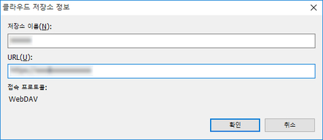 저장소 이름에 클라우드 저장소 이름을 입력하고 URL에 WebDAV에 접속하기 위한 URL을 입력한 후, 확인 버튼을 클릭합니다.