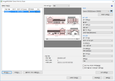 Direct Print & Share 메인 화면에서 파일을 지정하여 인쇄할 수 있습니다. 메인 화면은 왼쪽의 등록된 파일 목록, 가운데의 미리 보기 영역 및 오른쪽의 인쇄 설정 영역으로 구성되어 있습니다.