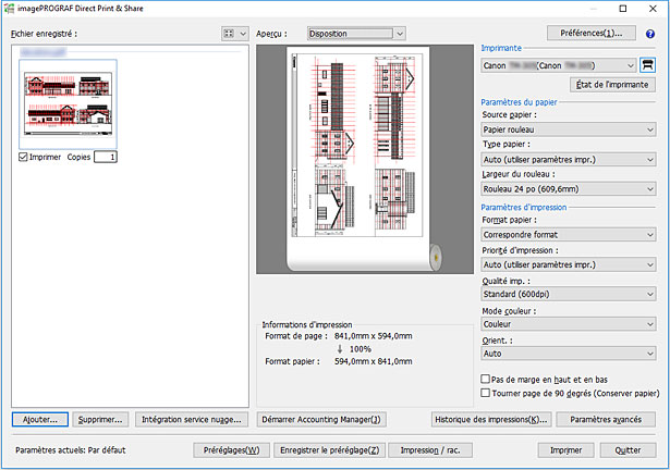 Si Disposition est sélectionné dans Aperçu, vous pouvez vérifier l'aperçu de la disposition du fichier sur la feuille, et les informations telles que la taille du document, la taille de la feuille de sortie et la résolution de sortie s'afficheront dans Informations d'impression.