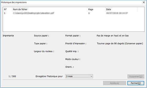 Les chemins d'accès aux fichiers et les date/heure d'impression des fichiers que vous avez imprimés précédemment s'affichent sous forme de liste. Si cette option est sélectionnée, les informations comme les imprimantes utilisées et les paramètres d'impression s'affichent en bas de la boîte de dialogue.
