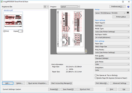 Se viene selezionato Layout in Anteprima, è possibile confermare in anteprima il layout del file sul foglio e visualizzare informazioni quali il formato del documento, il formato del foglio in uscita e la risoluzione di uscita in Informazioni di stampa.