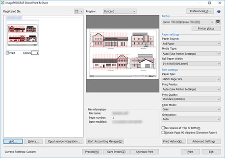 È possibile specificare i file e stamparli sulla schermata principale di Direct Print & Share. La schermata principale include nel complesso l'elenco File registrato a sinistra, l'area di anteprima al centro e l'area delle impostazioni di stampa a destra.