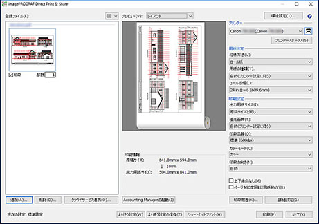 [プレビュー][レイアウト]を選ぶと、ファイルが用紙にどのようにレイアウトされるかがプレビューで確認でき、[印刷情報]に原稿サイズや出力用紙サイズ、出力解像度などが表示されます。