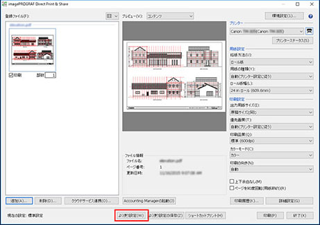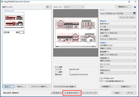 - ファイル形式がtiff/jpeg/PDFとHP-GL/2とではよく使う設定の保存項目が異なるため、保存時と異なるファイル形式へ印刷する場合は、よく使う設定に反映できません。