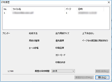 また、ダイアログボックスの画面左下に、保存されている履歴数が表示されています。保存可能な最大件数は500件です。