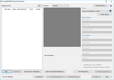 Le stampanti utilizzate con Direct Print & Share vengono aggiunte nel menu a discesa Stampante.